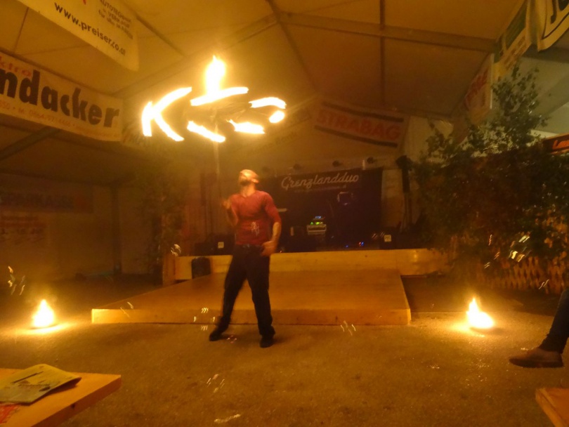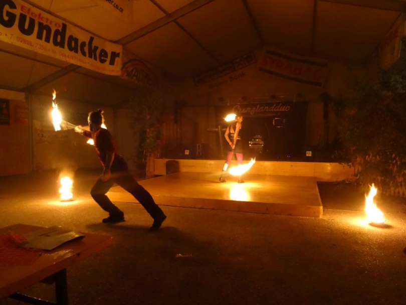 Die Pehendorfer haben sich heuer viel Neues einfallen lassen. Mit rustikalen Holzverbauungen wurde das Festzelt in verschiedene Bereiche geteilt. In der Lounge und der Herzerl-Bar konnte man sich gemütlich unterhalten und am späteren Abend wurden die Gäste mit einer mystischen Feuershow unterhalten. Aus der Küche servierte man neben den typischen Grillspeisen eine herzhafte Eierspeise und g’röste Knödel. Bei gemütlicher Tanzmusik vom „Grenzland-Duo“ schwangen die Gäste das Tanzbein in Dirndl und Lederhose bis in die frühen Morgenstunden.